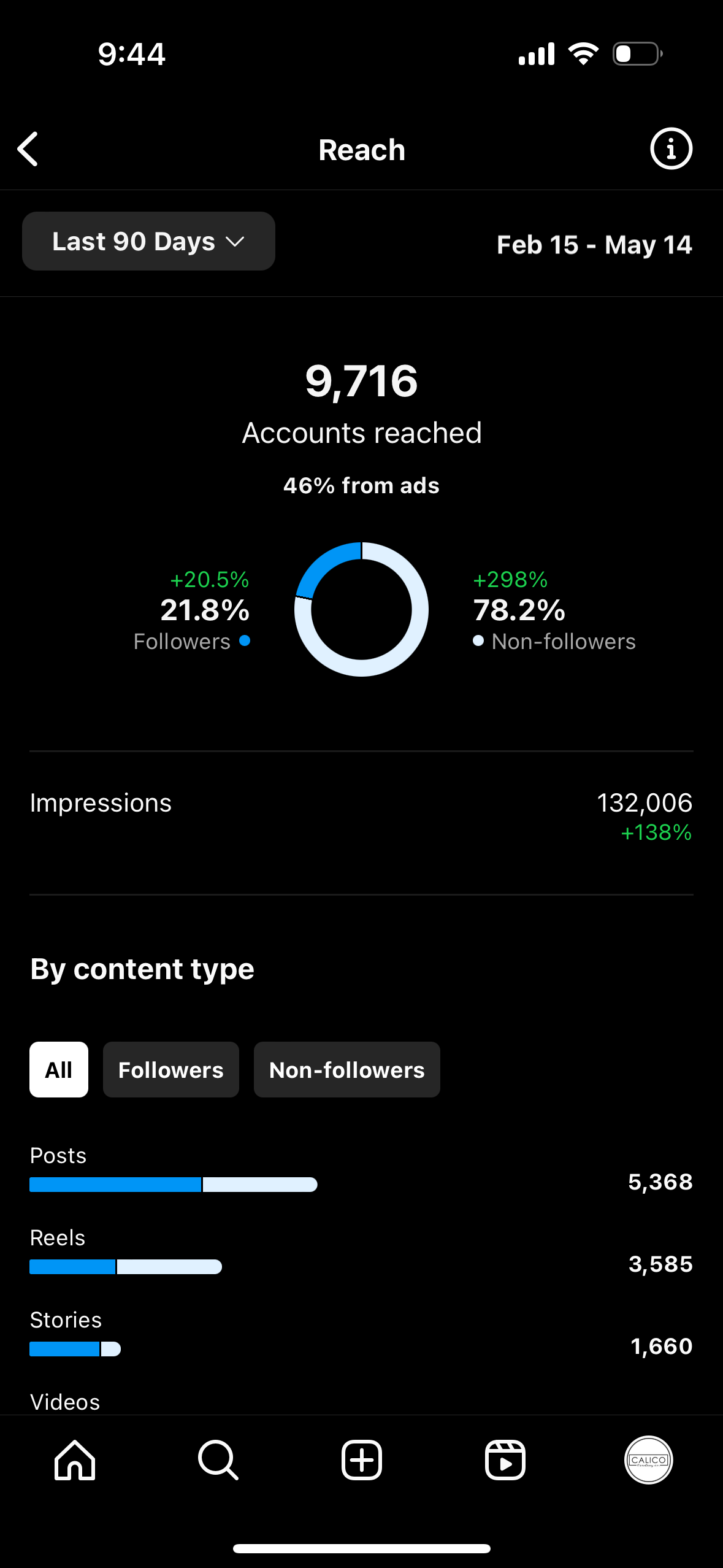 The analytics below represent the last 90 days currently. Since I have been working there for almost 3 years, our Instagram followers have grown from about 1,000 to almost 2,900. Our engagement with customers and other individuals has strongly increased with the company being tagged and featured on other pages and forms of media.